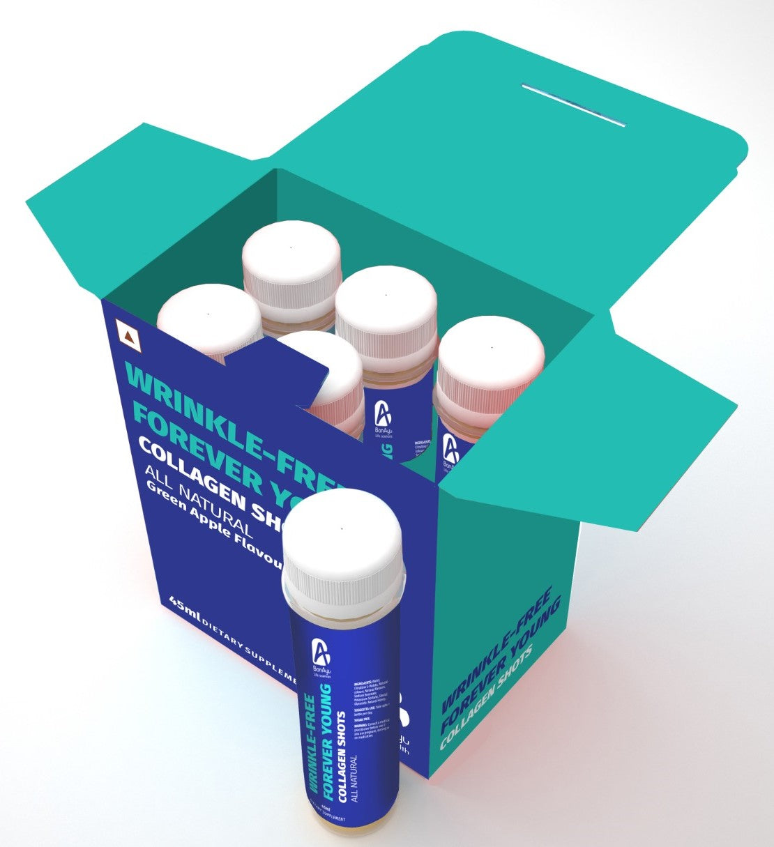 Wrinkle-Free Forever Young Collagen Shots are specially formulated to nourish your skin, hair, nails, and joints from within. Each shot delivers a potent blend of hydrolyzed collagen peptides and Vitamins, helping to improve skin elasticity, support joint health, and promote youthful vitality. Convenient, delicious, and ready-to-drink — experience beauty from the inside out.
